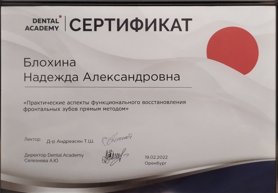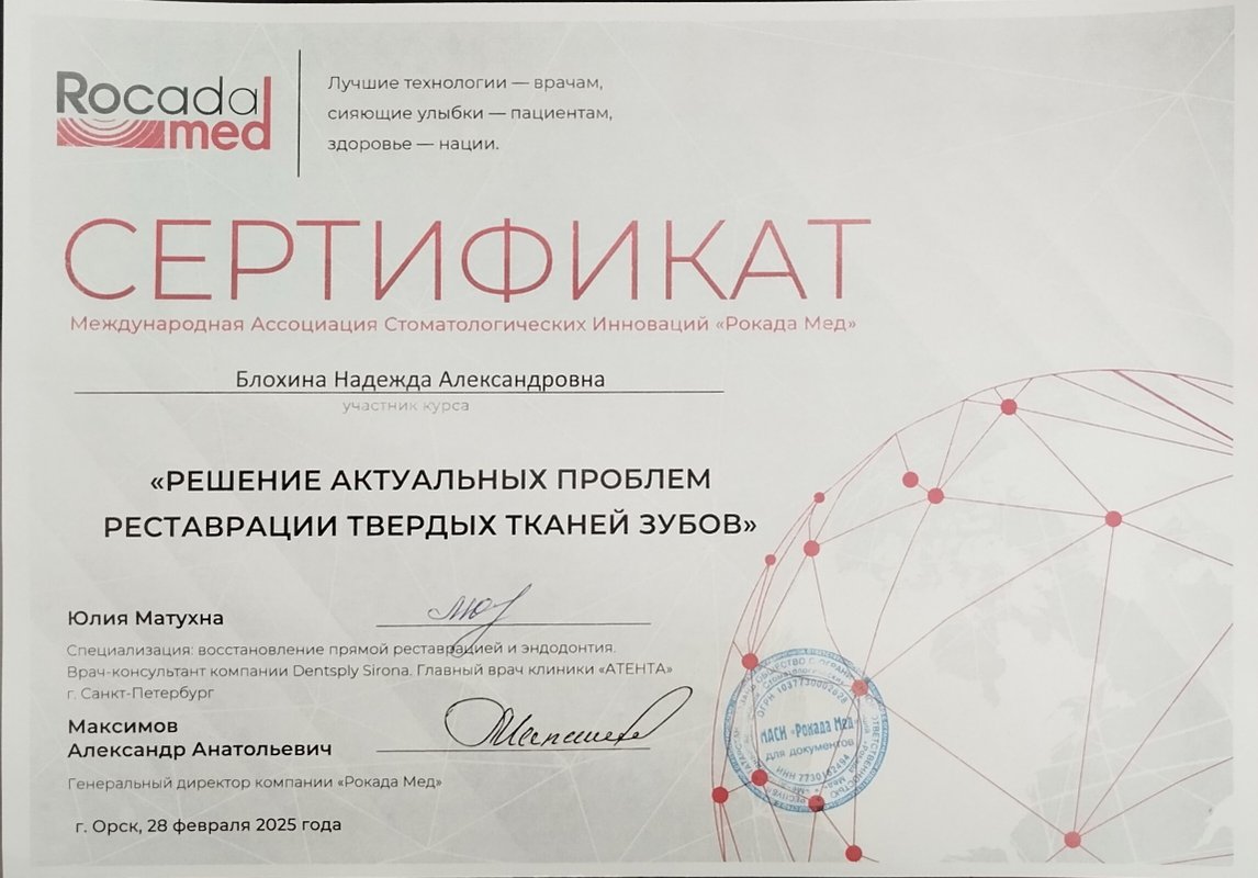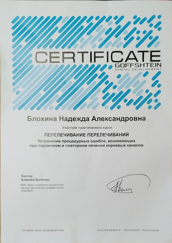 Я остался очень доволен работой Надежды Александровны Блохиной: все было выполнено тщательно, грамотно, с заботой и вежливо. Лечение и пломбирование сделали за один прием, после чего мне предоставили годовую гарантию и дали полезные советы по поддержанию здоровья. Уже записался на следующий визит.