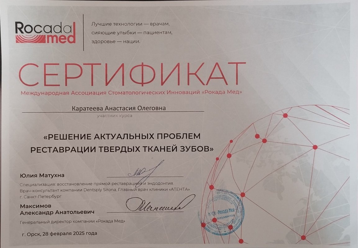 Больше всего запомнилось чуткое отношение персонала. Я очень нервничала, когда пришла с поломанным зубом, но меня отлично поддержали! Врач Каратеева временно восстановила зуб, сейчас я планирую имплантацию.