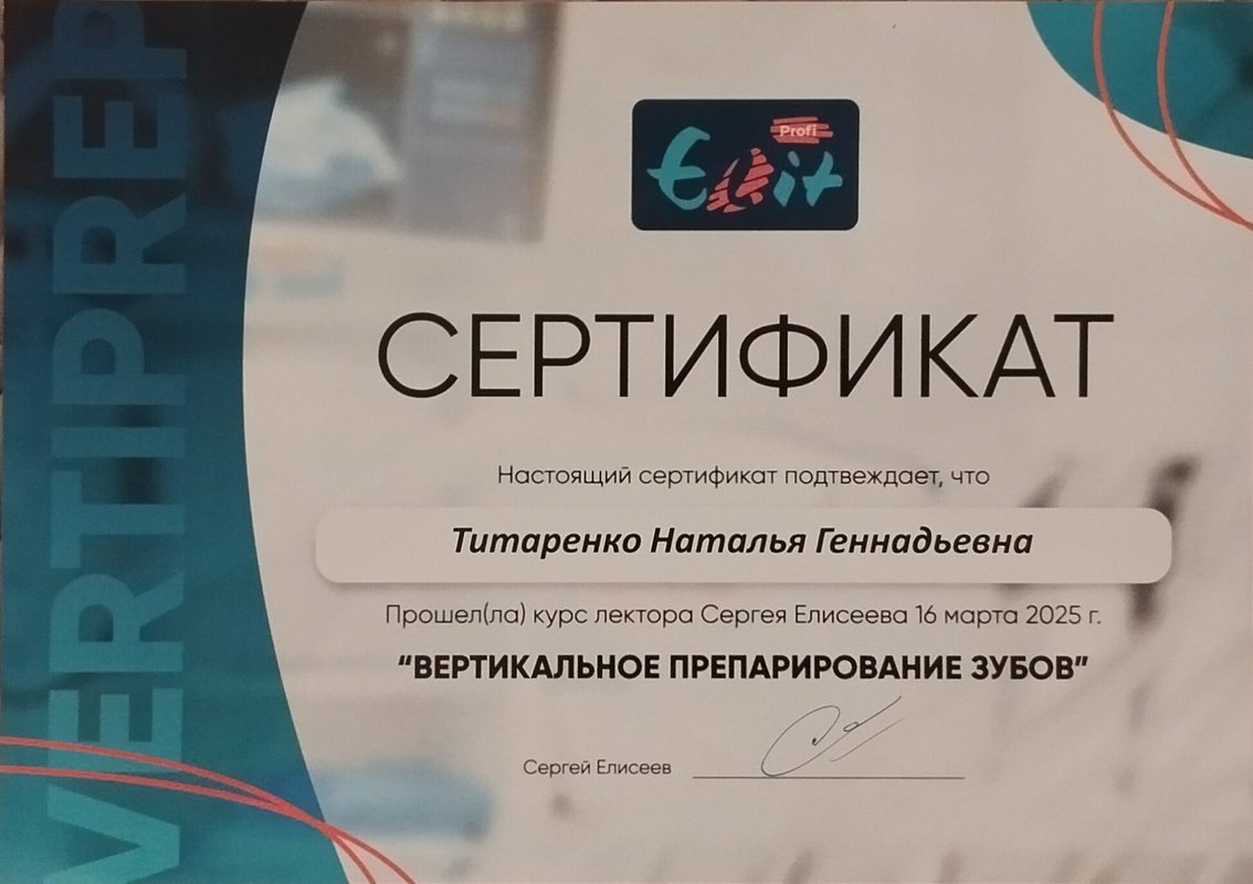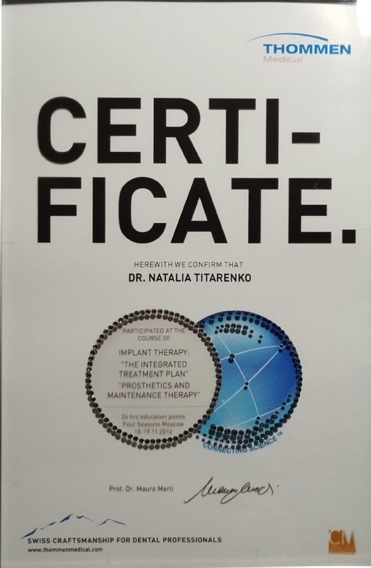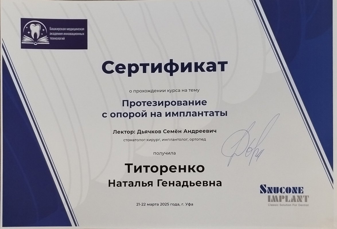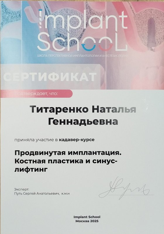 Я была у врача Натальи Геннадьевны Титаренко, меня впечатляет её мастерство. Она ставила мне импланты, которые уже 10 лет служат. Также я восстанавливала коронку на импланте и недавно была на консультации, Наталья доброжелательна, всегда отвечает на вопросы, а её профессионализм заметен. Последний прием включал консультацию и закрепление коронки, сейчас готовлюсь к установке нового импланта. Узнала об этом враче от знакомых, рекомендовали именно для установки имплантов.
